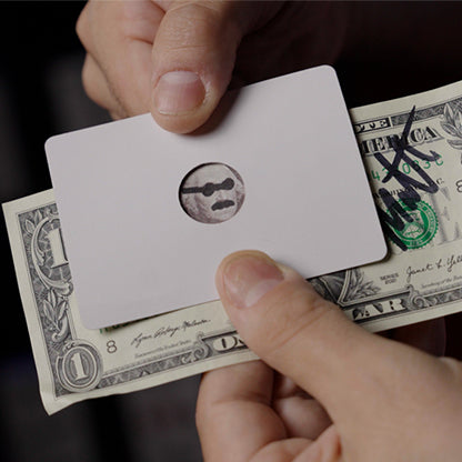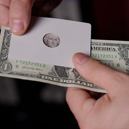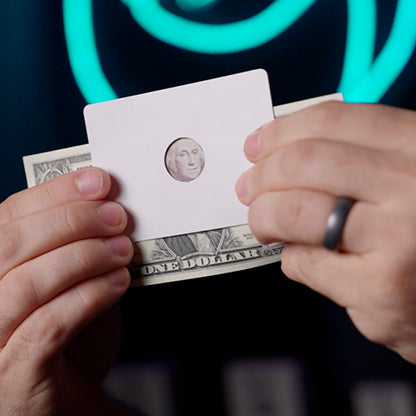 The hole card is placed over the borrowed bill, perfectly framing George Washington’s face. With no apparent moves, you magically slide George’s head upward to the top of the bill… then across to the right, over to the left, and finally back down to where it belongs.