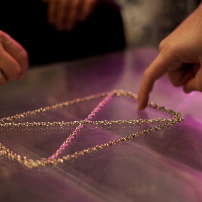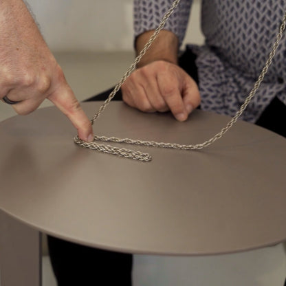 In Fast & Loose, a beautiful silver chain is thrown into a figure eight pattern. The spectator is invited to place their finger on one side or the other of the figure eight. When the chain is pulled, if it loops around the finger, it’s a win, but if it pulls loose, then it’s a loser. The chain is always pulled from the centre in the same way, but no matter how closely the pattern is examined, the spectator can’t win. The secret lies in the special patterns the magician can throw that look identical but contain a diabolical topological secret.
