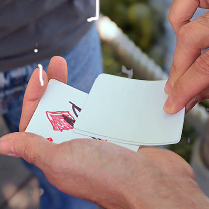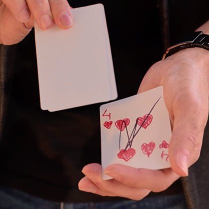 Imagine that a spectator freely chooses a card and signs it, then it is lost in the deck. Then, you show three cards completely blank from both sides. There is no trap, there is no suspicion. One by one, those cards begin to transform magically: first clumsy lines appear, as if drawn by a child... then, with an amazing visual crescendo, the strokes are perfected to form on the back. Now you do the same with the face "painting" a raw image of his signed card (including his "fake signature") to finish this visual process transforming that into a perfect reproduction of the signed card, which is exactly the spectator's card! Or not?