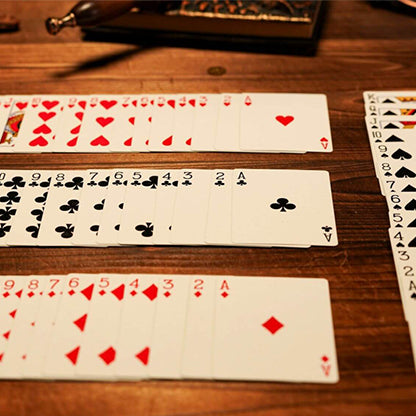 The sequence builds further as he produces additional Spade court and value cards: 10, J, Q, and K. Then, in a flash, the remaining Spades from 2 through 7 appear as well.