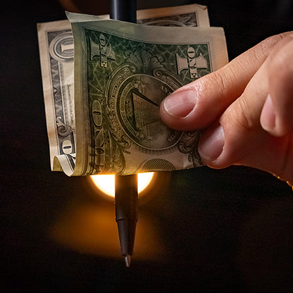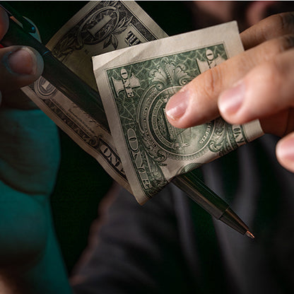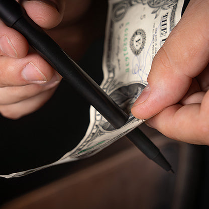Borrow a bill from your spectator. With one smooth motion, you visually push a pen straight through it. Then, just as quickly, you pull the pen out — and the bill is completely unharmed.