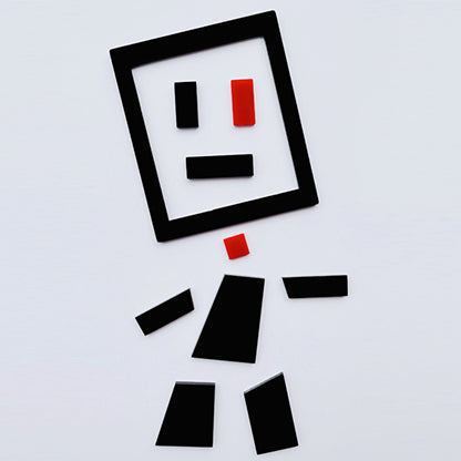However, when the magician picks up the tangram pieces again, they have all merged into a single solid piece. The two small red squares that were just added have also combined into one, forming a heart-shaped pattern.